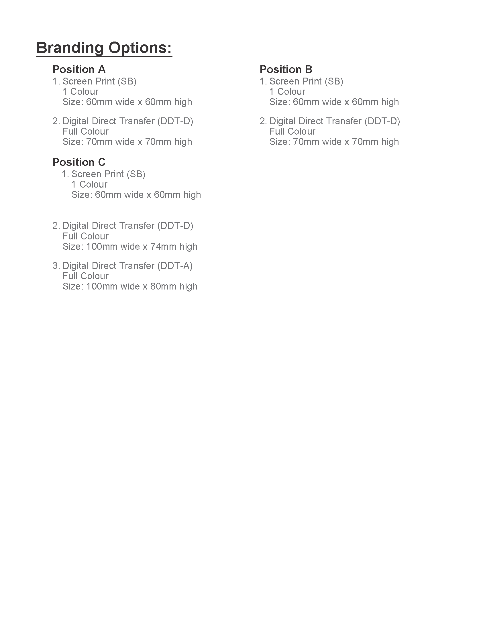 Product Specifications * All sizes measured in cm. Carton Dimensions (in cm)55H X 40L X 35WCarton Weight (in kg)8.62Quantity per Carton20 Standard Branding Guide LOGO 24 Branding Guide