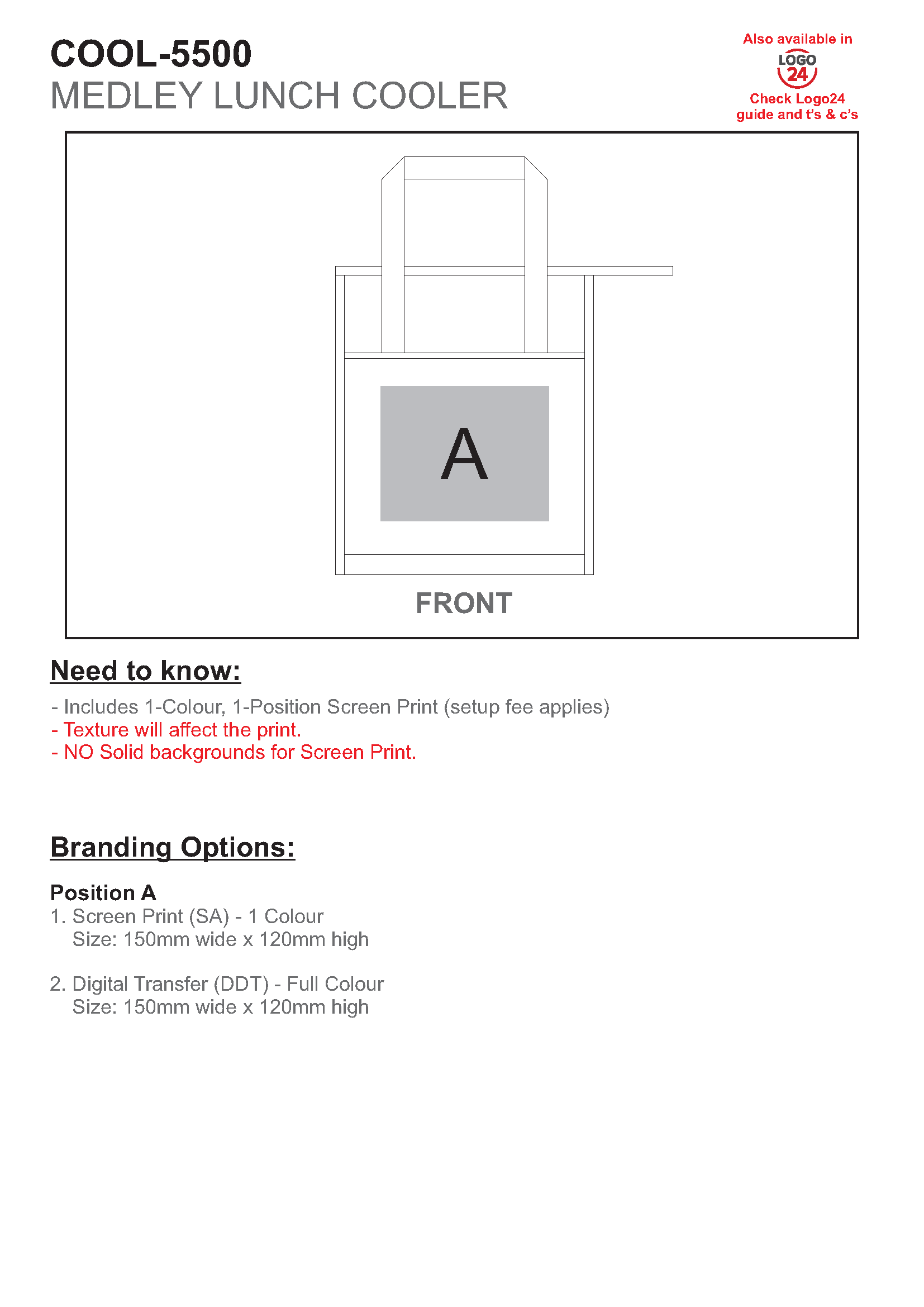 Product Specifications * All sizes measured in cm. Carton Dimensions (in cm)70H X 58L X 49WCarton Weight (in kg)10.8Quantity per Carton200 Standard Branding Guide LOGO 24 Branding Guide